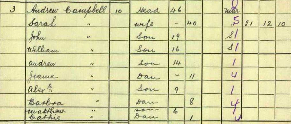 By 1911, Andrew and Sarah Campbell have been married for twenty-one years and have ten children. Agnes, now twenty-one, and Maggie, 18, no longer live at home but the rest of the family from John, aged 19, William, 16, Andrew 14, Jeannie 11, Alex. 9, Barbara 8, Matthew 6, to Cathie aged just one are all living at 8, Gilmour Street, Kilmarnock, a three roomed home.